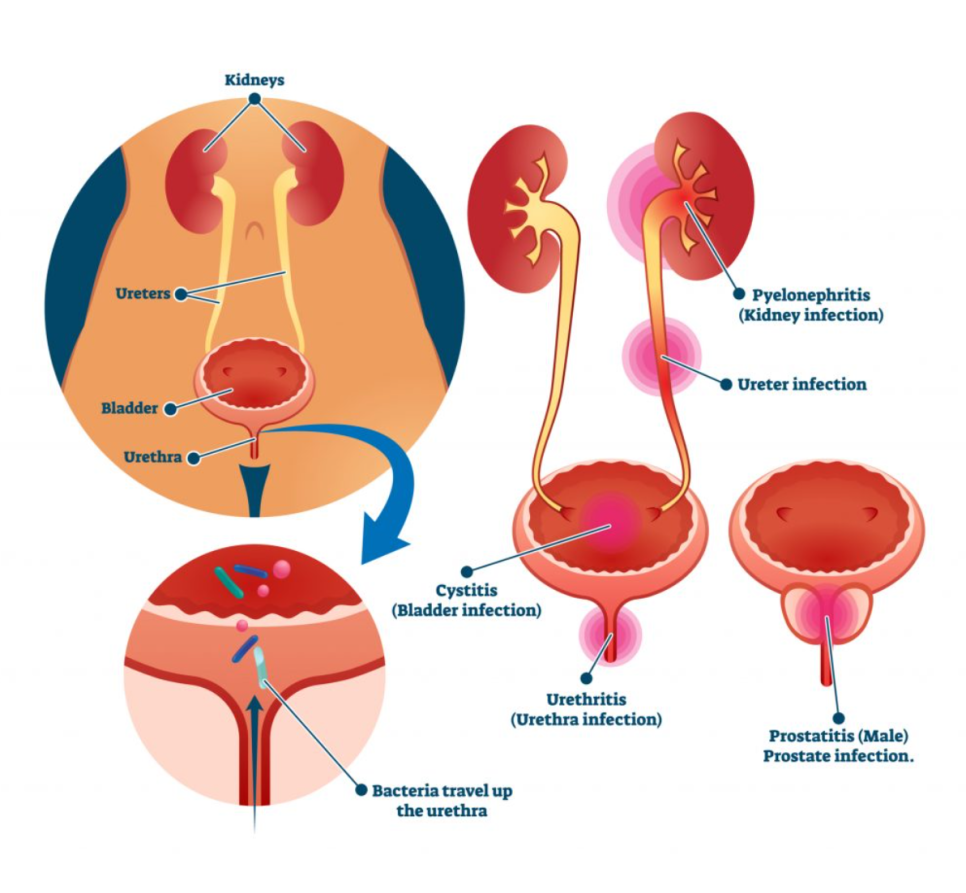 요로감염(UTI, Urinary Tract Infection)과 방광염을 같은 질환으로 생각하시는 분들이 많은데, 저는 실제 임상에서 보니 둘은 범위가 다른 개념이었습니다. 요로감염은 소변이 지나가는 모든 경로, 즉 요도·방광·요관·신장 전체에 생기는 감염을 통틀어 말합니다. 여기서 UTI란 Urinary(요로)와 Tract(길), Infection(감염)이 합쳐진 용어로, 소변이 이동하는 길 전체의 감염을 의미합니다.